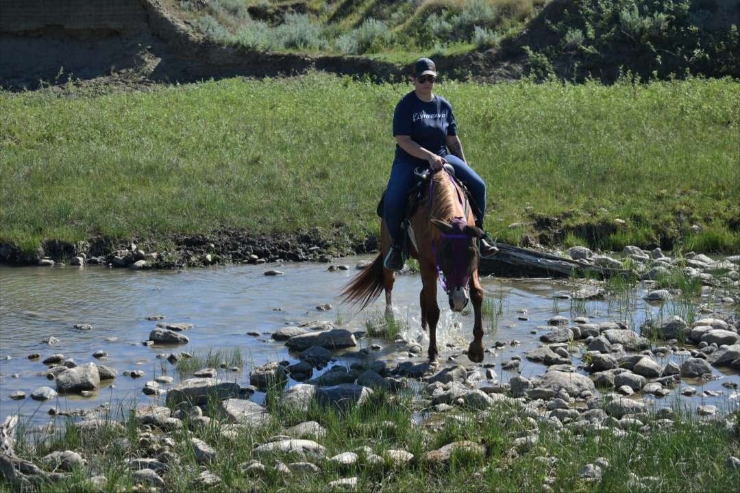 - Walks, trots, and canters in arena and open fields.