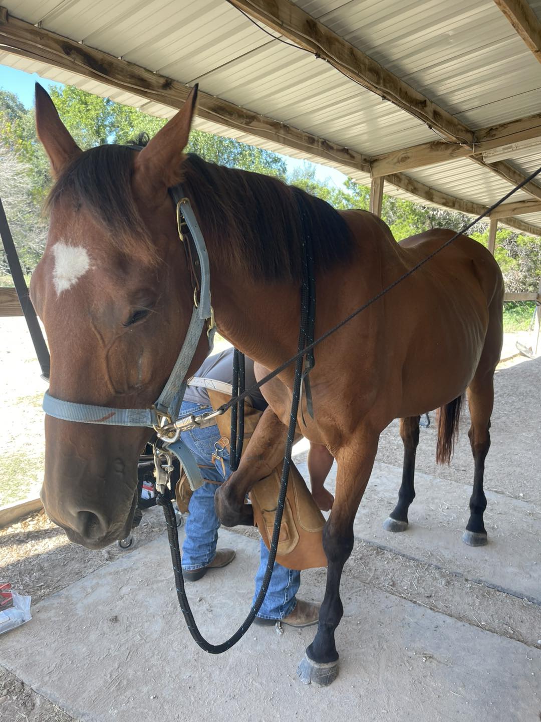 - Stands tied patiently for grooming, baths, fly spray, and hoof care