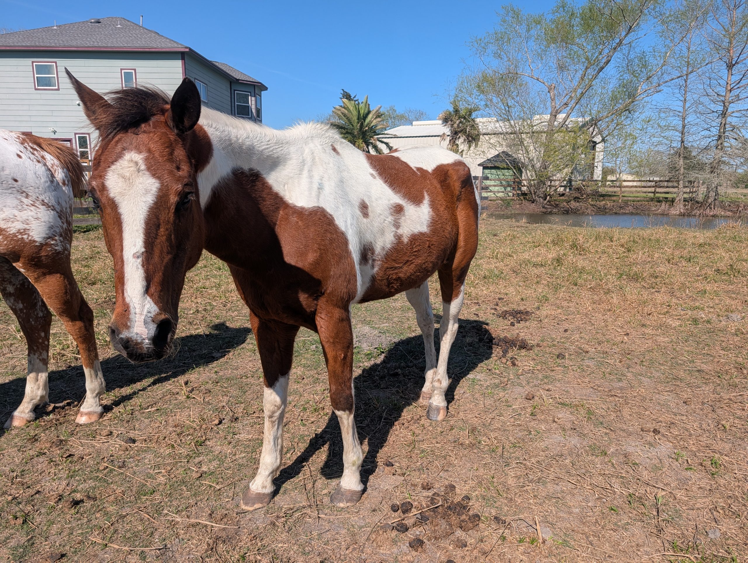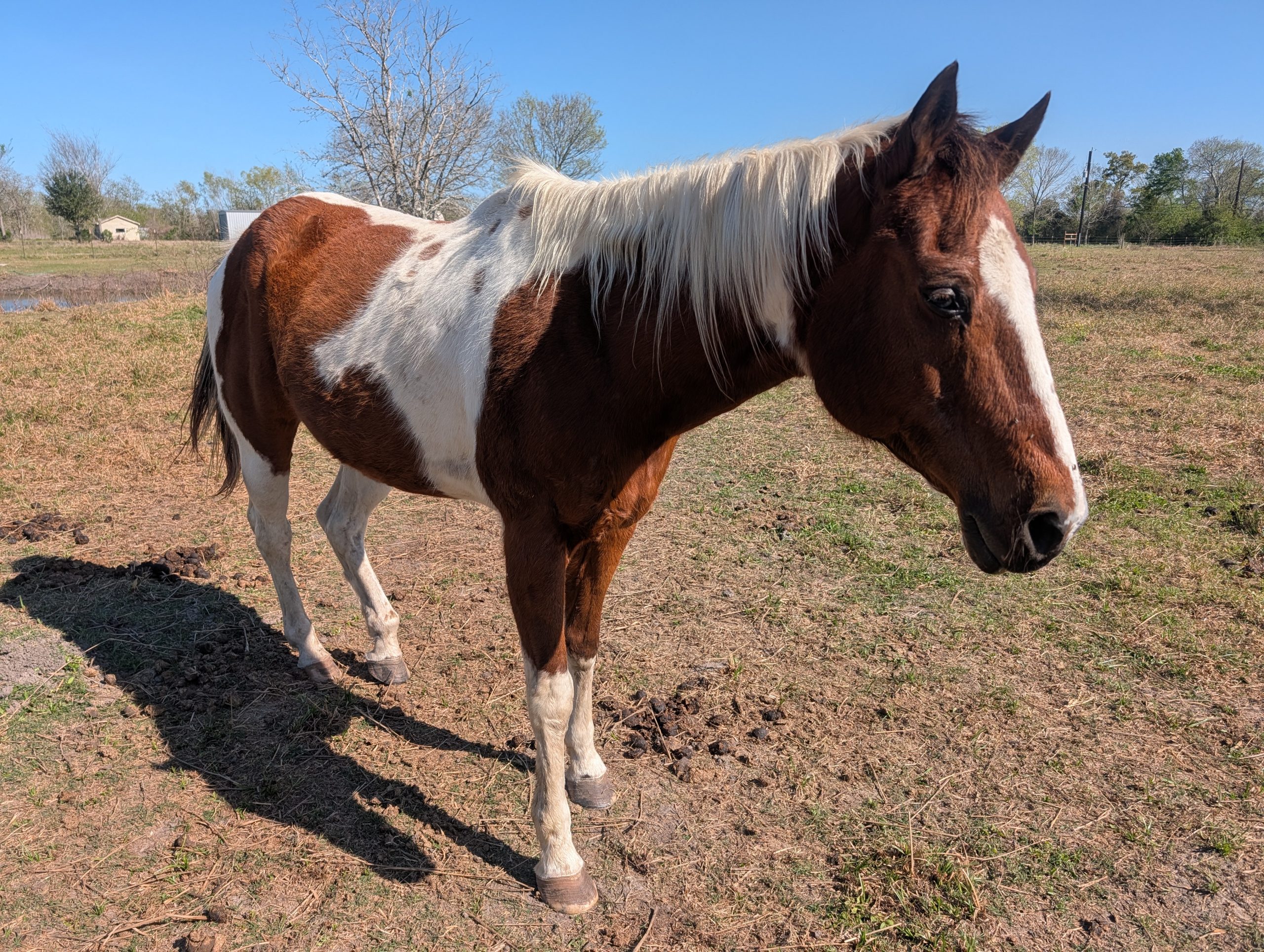 Milkshake came to foster home with shoes and they have been removed. He is sound and doing well. Stands tied, good for farrier and loves attention.